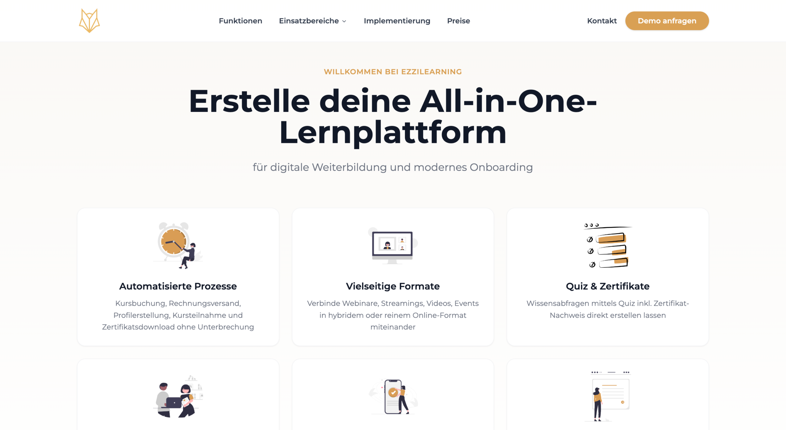 Erstellung einer modernen Lernplattform mit KI – gebaut mit base44. Die Plattform stellt Lernformate vor und generiert Demo-Anfragen automatisiert. Ein Beispiel dafür, wie KI nicht nur Inhalt liefert, sondern den gesamten Prozess vom Design bis zur Funktion übernimmt.